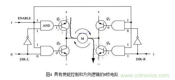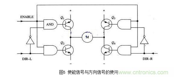 改進電路在基本H橋電路的基礎上增加了4個與門和2個非門。4個與門同一個“使能”導通信號相接,這樣,用這一個信號就能控制整個電路的開關。而2個非門通過提供一種方向輸人,可以保證任何時候在H橋的同側腿上都只有一個三極管能導通。(與本節前面的示意圖一樣,圖4所示也不是一個完整的電路圖,特別是圖中與門和三極管直接連接是不能正常工作的。)