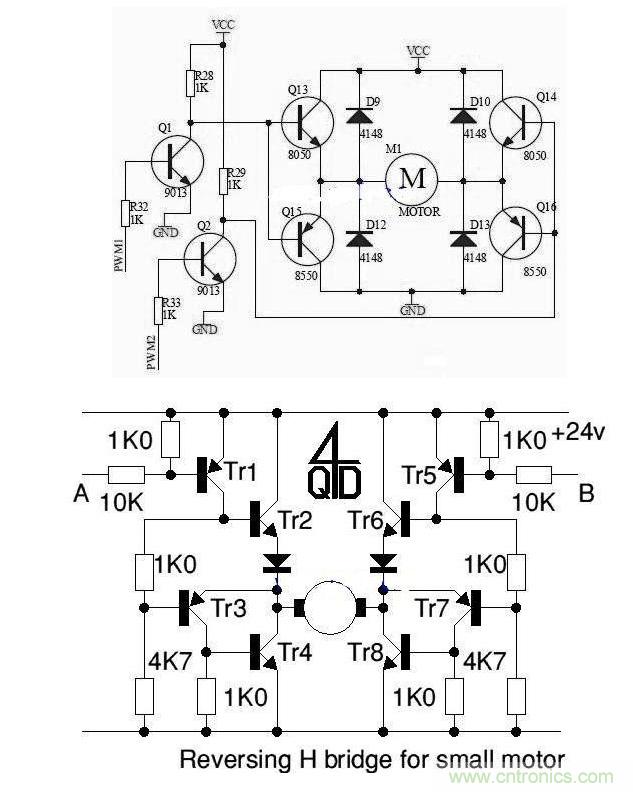 附兩張分立元件的H橋驅動電路: