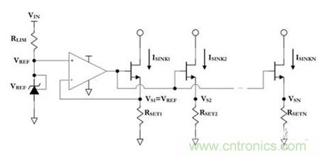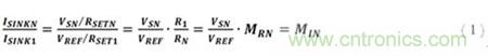 最終MOSFET(金氧半場(chǎng)效晶體管)源電壓VS以及RSET電阻決定著各柱上的灌電流(sink current);通過(guò)去除來(lái)自外部電流沉柱的反饋(即所有N》1),已失去對(duì)VSN的直接控制。因此,RSETN必須精心選擇以生成預(yù)期的任意第N個(gè)柱的灌電流,即ISINKN。仔細(xì)觀察上面的圖1,很容易得出定義偏置網(wǎng)絡(luò)第N個(gè)柱電流與第1個(gè)柱電流的比值的等式︰