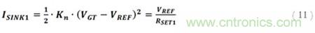 必須注意的是,這里可以很大程度上忽略通道寬度調(diào)制的影響。這是因?yàn)槿魏我蚵O電壓上升導(dǎo)致的漏極電流的上升會(huì)在通過(guò)RSET電阻后下降,并導(dǎo)致源電壓的上升。為了使MOSFET能維持任何電流,柵極電壓必須大于源電壓與閾值電壓的和。也就是說(shuō),給定一個(gè)柵極電壓,源電壓將被限制在至少比柵極電壓小一個(gè)閾值電壓的值,且再大的漏極電壓上升也不會(huì)提升漏極電流。因此,構(gòu)建相應(yīng)運(yùn)行條件,RSET必須足夠大,從而確保在上述限制下可允許作出以下假設(shè):