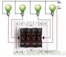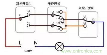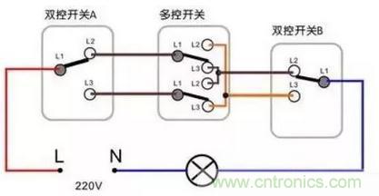 這樣的線路在電梯中常用,當然有時臥室改的細致一點,床左右都加上開關,門口再一個,也是單聯三控線路了。