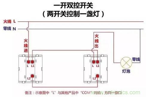 圖中L1、L11、L12是一組單開雙控開關,L2、L21、L22是另一組單開雙控開關,可知,三控開關其實是兩組單開雙控開關組合在一起的,如果我們在購買不到三控開關的情況下,我們可以購買雙開雙控(雙聯雙控)開關,然后用膠水(這個就很多了)把開關中間的縫隙粘起來,這樣就做成了單開三控開關了。下面是接線示意圖: