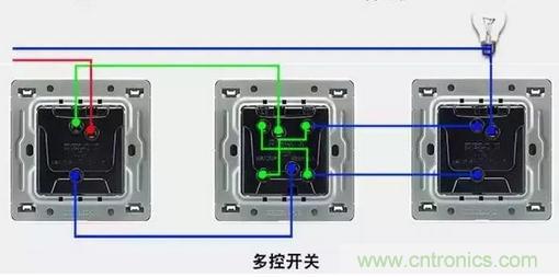 這里要新介紹一個開關,叫做三控開關。開關布置的順序是,單開雙控→三控開關→單開雙控。先看個三控開關的圖,能更好理解,如下: