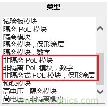 為方便工程師選料,Digi-Key官網(wǎng)上的「電源 - 板安裝」分類中的「直流轉(zhuǎn)換器」子分類中,在「類型」中已將PoL產(chǎn)品列出,方便工程師更快更準確地選料。