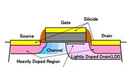 1.“低摻雜漏極”(LDD)區包圍該晶體管的漏極,并與門極重疊。這一結構既能降低水平擴展至漏極的電場,也能降低垂直擴展至門極氧氣層的電場,從而增加了擊穿電壓。