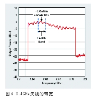 確定天線帶寬的兩種常見方法是:1)在相關(guān)頻帶上調(diào)節(jié)載波的同時對輻射功率進行測量;2)使用網(wǎng)絡(luò)分析儀對天線饋電點的反射進行測量。圖4顯示了第一種方法,其對一個2.4GHz 天線的輻射功率進行測量,這種天線在2.4GHz頻帶上具有接近2dB的輸出功率變化,同時還具有接近于這一頻帶中心的最大輻射。這種測量方法是通過對2.3~2.8GHz的連續(xù)波信號進行調(diào)節(jié)來完成的。這類方法應(yīng)該在一個無回音室中進行,以獲得正確的絕對帶寬級別。然而,即使在沒有無回音室的情況下,這種方法也非常有用。