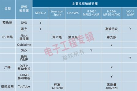 對于想在手機(jī)上觀看視頻的用戶來說,移動(dòng)多媒體處理器需要識別和支持多種視頻編碼標(biāo)準(zhǔn)。表1列出了目前在用的各種視頻編解碼器。內(nèi)容兼容性是支持“任何地方,任何內(nèi)容”這個(gè)理想目標(biāo)的關(guān)鍵。為了推進(jìn)移動(dòng)視頻的普及,用戶不必知道他們的設(shè)備支持何種格式或分辨率。用戶也許不能在他們的手機(jī)上以全高清的分辨率觀看高清編碼的視頻,但他們希望能用手機(jī)播放出來,并能輸送到電視機(jī)上觀看。