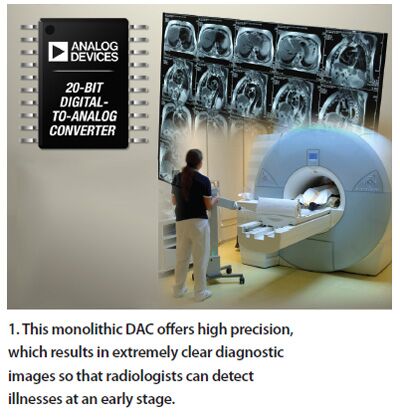 諸如MRI等成像設(shè)備的使用普及率在增加,目前全球每年要實施超過6千萬例MRI診斷。它們通常用于診斷阿爾茨海默氏癥(老年癡呆癥)、癌癥細(xì)胞和韌帶撕裂等各種疾病和損傷。成像系統(tǒng)采用了多種射頻/微波器件,包括振蕩器、發(fā)射器和天線。例如,ADI公司現(xiàn)在就提供一款為提高成像分辨率而設(shè)計的20位數(shù)據(jù)轉(zhuǎn)換器(DAC)AD5791。