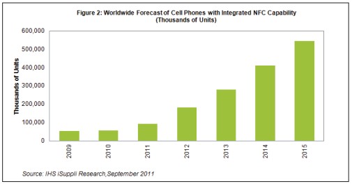 圖中所示為IHS iSuppli公司對NFC手機全球出貨量的預(yù)測。