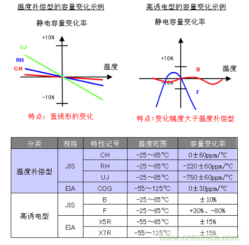 陶瓷電容器如圖2所示,可分為溫度補償型與高誘電型。由于各種溫度條件下的靜電容量變化情況各不相同,因此需要根據電容的特點來確定其用途。日本國內所采用的JIS規格、歐洲所采用的EIA規格均做出了詳細的分類