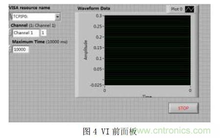 啟動LabVIEW 創建一個新的VI 文件。這里以從示波器讀取數據,并顯示在波形控件上為例。