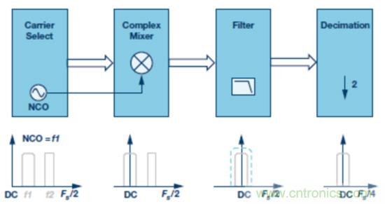 典型DDC模塊包括載波選擇、下變頻器、濾波器和抽取器。這些功能模塊按順序工作,或者可分別予以旁路,最終根據后續(xù)FPGA或ASIC(其采樣速率較低)的要求,產生一個位于DC的復信號或一個實信號。