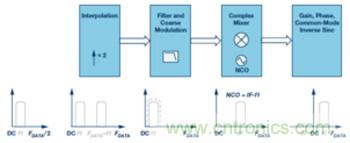 Tx鏈具有與Rx鏈相同的要求:需要高采樣速率以簡化濾波器設計,使信號頻率位于高中頻或直接變?yōu)樯漕l,以及遠遠地推開鏡像,但接口希望使用較低的數據速率。轉換器的集成DUC將解決這些要求。圖3是典型DUC的框圖。