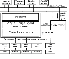 數據融合系統采用分布式體系結構,即每個近距離傳感器對獲得的回波信號先進行局部處理,然后送入融合中心進行融合以獲得目標的方位、速度信息。控制器是整個雷達網絡系統的最終決策機構,它負責識別目標的距離和速度信息是否對行車安全構成威脅,并通過聲光的形式提示駕駛員或者直接作用于車載控制系統加以調整。