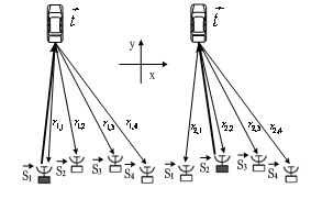 汽車雷達網絡測量目標的距離和速度是通過對每個傳感器測得的目標信息進行數據融合而得到的。在一個測量周期中,每個NDS輪流擔當一次發射機。因此有16種距離和相對速度的組合,用向量表示為: