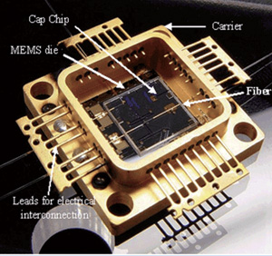 圖3微型光機(jī)械系統(tǒng)(MOEMS)交換器件的管芯被4條光纖和連接線連接,并封裝在工業(yè)標(biāo)準(zhǔn)的Covar金屬封裝內(nèi)