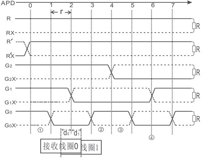 在t0、t1、t2、t3、t4時間段,分別向傳輸對線R、R’、G2、G1、G0發送載波信號,在t5時間段不發送。車上天線箱中有兩個接收線圈:接收線圈0和接收線圈1。APD檢測是從接收線圈0感應信號的相位中得到APD位置。在t0時間段,線圈0感應的是R線發送的信號,稱為R信號;在t1時間段,線圈0感應的是R’信號,R’信號與R信號反相,記為=1,作為起始位;在t2時間段,線圈0感應的是G2線發送的信號,G2=0或1,取決于接收線圈0的位置。若接收線圈0的中線分別在①、②、③、④的位置,則接收線圈0的接收信號的相位如圖3所示。