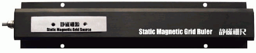 靜磁柵位移傳感器由“靜磁柵源”和“靜磁柵尺”兩部分結合使用。“靜磁柵源”使用鋁合金壓封無源釹鐵硼磁柵組成磁柵編碼陣列;“靜磁柵尺”用內藏嵌入式微處理器系統的特制高強度鋁合金管材封裝,使用開關型霍爾傳感器件組成霍爾編碼陣列,鋁合金管材外部使用防氧化鍍塑處理。“靜磁柵源”沿“靜磁柵尺”軸線作無接觸(相對間隙寬容度和相對姿態寬容度達50mm)相對運動時,由“靜磁柵尺”解析出數字化位移信息,直接產生高于毫米數量級的位移量數字信號。充分發掘嵌入式微處理器的資源,將數據更新速度提高到毫秒數量級,以便能適應5m/S以下運動速度的位移響應。