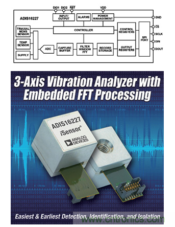 在一些應用案例中,相對簡單的傳感器輸出可能就足夠了,但在另一些應用中(例如,通過震動分析進行狀態(tài)監(jiān)控),則需要增加相當多的處理過程才能實現(xiàn)所需的輸出。圍繞慣性傳感器而構(gòu)建的一個高集成度器件示例是ADIS16227(見圖2),它是一款完全自治的頻域震動監(jiān)控器。此類器件可能不提供相對簡單的g/mV輸出,而是提供特定應用分析。在本例中,其嵌入式頻域處理、512點實值FFT和片上存儲器能夠識別各震動源并進行歸類,監(jiān)控其隨時間的變化情況,并根據(jù)可編程的閾值做出反應。