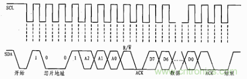 AD7416采用I2C串行總線和數(shù)據(jù)傳輸協(xié)議來實(shí)現(xiàn)同外設(shè)的數(shù)據(jù)傳輸。在數(shù)據(jù)傳輸過程中AD7416作為從器件通過數(shù)據(jù)輸入/輸出線SDA以及時(shí)鐘信號(hào)線SCL與總線相連。其傳輸時(shí)序如圖3所示。當(dāng)SCL保持高電平時(shí),SDA從高電平到低電平的跳變?yōu)閿?shù)據(jù)傳輸?shù)拈_始信號(hào),隨后傳送AD7416的地址信息的讀/寫控制位。其地址信息的格式為:100A2A1A0R/W。