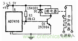 這些默認(rèn)值可使該溫度傳感器在不連接串行總線時(shí)用作自動(dòng)調(diào)溫器,圖4所示就是AD7416作為自動(dòng)調(diào)溫器的典型應(yīng)用電路原理圖。當(dāng)被測量的環(huán)境溫度低于 THYST時(shí),OTI輸出高電平,Q1導(dǎo)通,繼電器吸合,加熱器開始工作;當(dāng)被測量的環(huán)境溫度高于TOTI時(shí),OTI輸出低電平,將Q1的基極電位拉低以使其截止,繼電器釋放,加熱器停止工作。