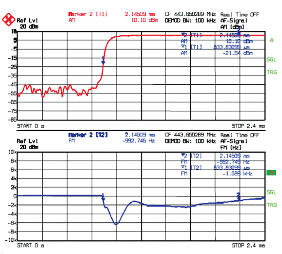 對于發(fā)射機和頻綜源來說,它們的幅度、頻率和相位瞬態(tài)特性是重要的測試指標(biāo)。一般來說,頻率穩(wěn)定時間是指發(fā)射機在輸出電平達(dá)到一定數(shù)值(通常為穩(wěn)定輸出功率-30dB)開始,監(jiān)測FM解調(diào)頻譜,直到頻率穩(wěn)定到設(shè)計限值之內(nèi)的這一段時間。