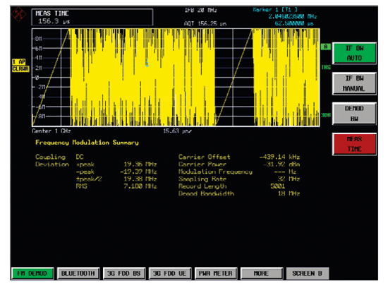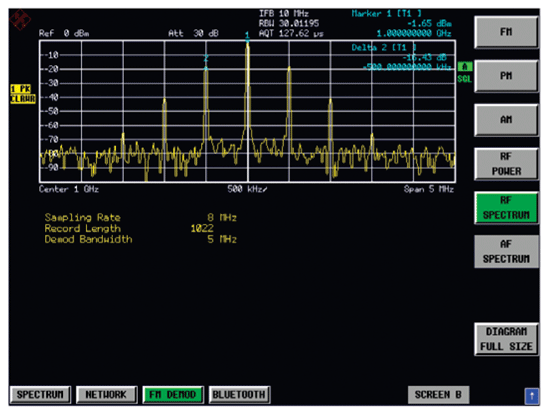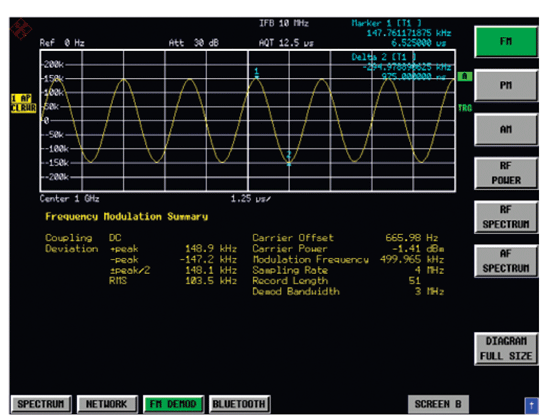 圖6是羅德與施瓦茨公司頻譜儀選件FS-K7在分析調(diào)頻信號的應(yīng)用。它采用上述解調(diào)原理,可以實時解調(diào)調(diào)頻、調(diào)幅、調(diào)相和實時頻譜。