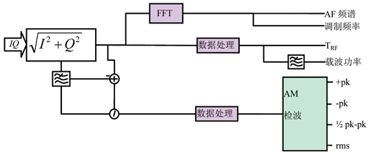 對此數(shù)組進(jìn)行窄帶低通濾波,獲得載波幅度數(shù)組Vc ,計算AM-DC與Vc的差分?jǐn)?shù)組,它與Vc的比值A(chǔ)Mdeep 數(shù)組表述調(diào)制深度,對其進(jìn)行檢波:正峰值 (+pk):數(shù)組中的最大值;負(fù)峰值 (+pk):數(shù)組中的最小值;峰-峰值/2 (1/2pk-pk):數(shù)組中的最大值與最小值差值的一半;均方根值 (rms):數(shù)組中數(shù)值的均方根值。