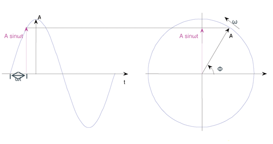 圖1 時域表述的正弦波與矢量信號的對應(yīng)關(guān)系
